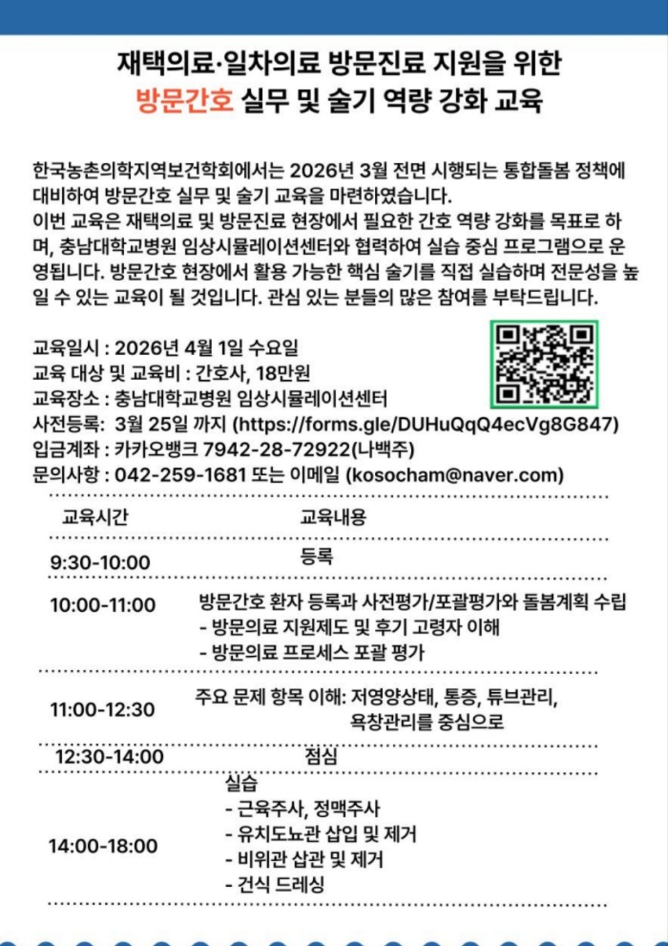 위와 같이 재택의료·일차의료 방문진료 지원을 위한 「방문간호 실무 및 술기 역량 강화 교육」을 개최하오니, 관련 기관이나 현장에서 방문간호 업무에 종사하는 분들의 많은 참여 부탁드립니다. ■ 사전등록 마감: 2026년 3월 25일 신청 링크: https://forms.gle/DUHuQqQ4ecVg8G847